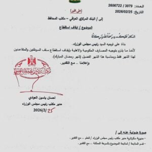 وجاء في وثيقة صادرة عن مدير مكتب رئيس الوزراء احسان العوادي وموجهة الى البنك المركزي انه “بناء على توجيه رئيس الوزراء، أخذ ما يلزم بتوجيه المصارف الحكومية والأهلية بإيقاف استقطاع سلف الموظفين والمتقاعدين للشهر الحالي فقط بمناسبة شهر رمضان المبارك”.